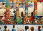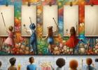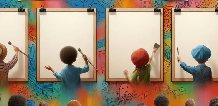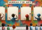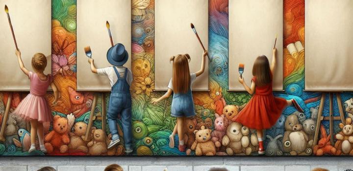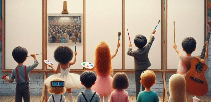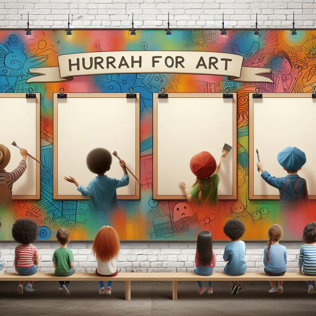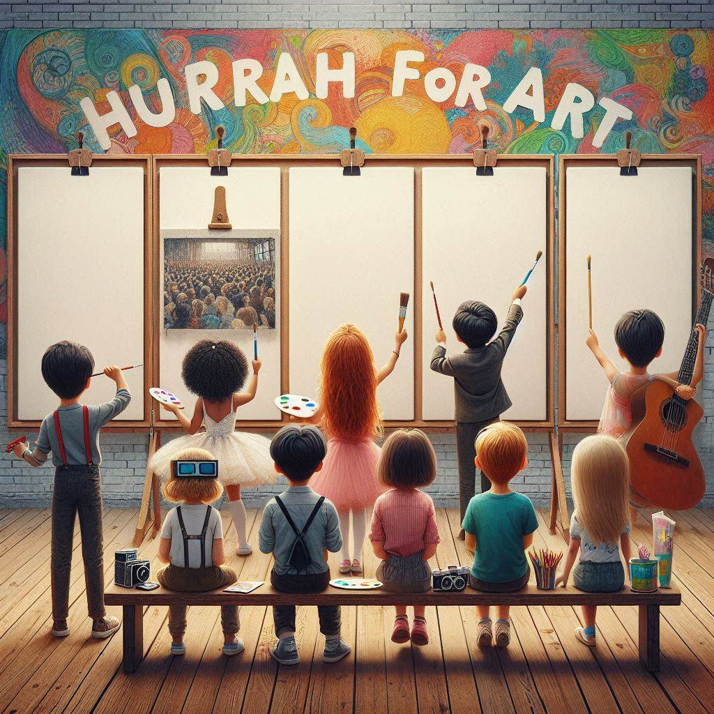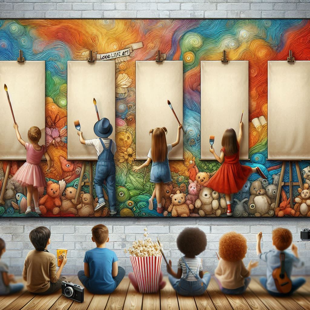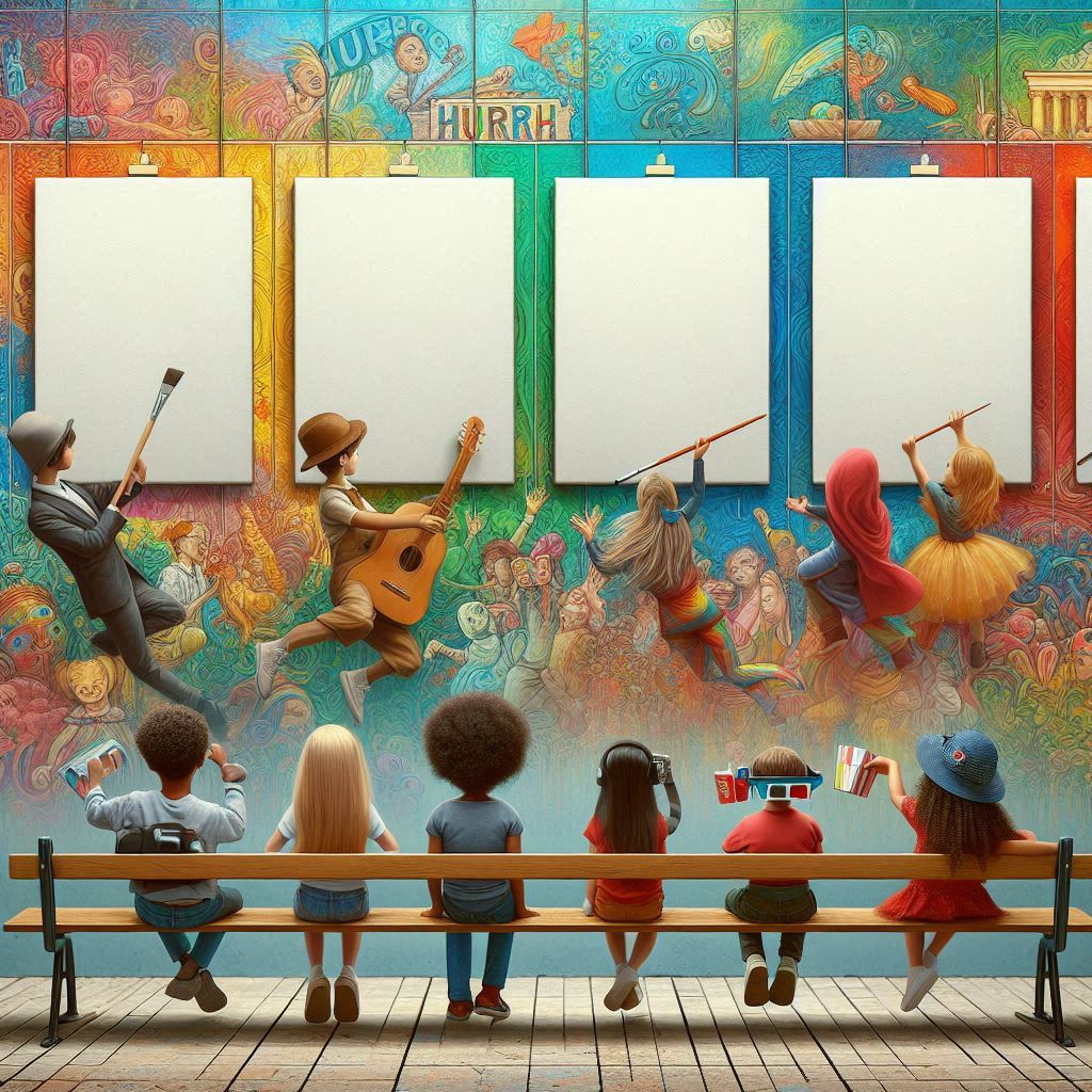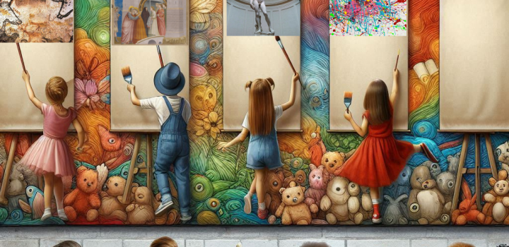 La nostra idea di arte è racchiusa in questa immagine che raffigura un murales in stile “street art” realizzato lungo la parete di un corridoio scolastico con spettatori bambini raffigurati di spalle, alcuni in atto di dipingere e riprodurre l’opera o la tecnica artistica riportata nella parte alta della loro tela, altri in una sorta di personificazione di forme artistiche. In cima la scritta “long life art” come in una sorta di slogan di un manifesto pubblicitario. I dipinti riproposti hanno l’obiettivo di ripercorrere in maniera sintetica le tappe fondamentali della storia dell’arte e di presentare al pubblico diversi ambiti (pittura, architettura, scultura) e tecniche, iniziando dall’arte rupestre (grotta di Lascaux), passando per l’arte medievale con la scena affrescata da Giotto che ritrae il bacio tra Gioacchino e Anna (Cappella degli Scrovegni) e l’arte moderna con il grande architetto-scultore-pittore Michelangelo e il suo David, sino ad arrivare all’arte contemporanea qui proposta con la tecnica del dripping di Jackson Pollock. La tela bianca simboleggia il futuro e la libertà di espressione creativa di ogni individuo. Ciascuna opera selezionata è pensata anche come parte di un progetto didattico-formativo da presentare ai bambini della scuola materna e primaria per favorirne l’apprendimento attraverso una loro interazione attiva. Utilizzati schizzi su carta e IA: Chat-GPT, Canva e Copilot.